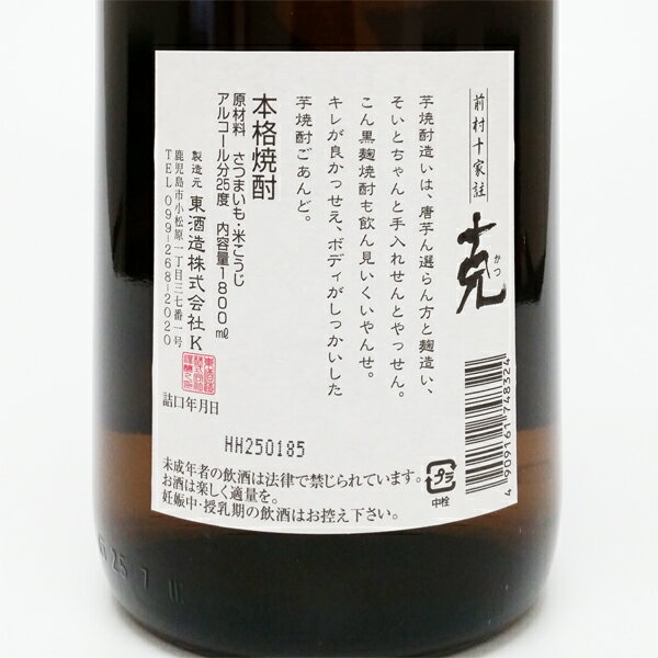 製品詳細情報 産地 鹿児島県 鹿児島市 蔵元 東酒造株式会社 特定名称 芋焼酎(乙類) 容量 1800ml 原材料 さつま芋・米麹 麹種類 白麹・黒麹ブレンド 蒸留 常圧蒸留 アルコール度 25度 コメント 数々のプレミアム焼酎を醸してきた現代焼酎界の巨匠「前村貞夫」杜氏が弟子達に残したバイブル的 焼酎! 克赤ラベルの原酒を甕貯蔵熟成後、黒麹仕込みの原酒をメインにブレンドして仕上げてあります。