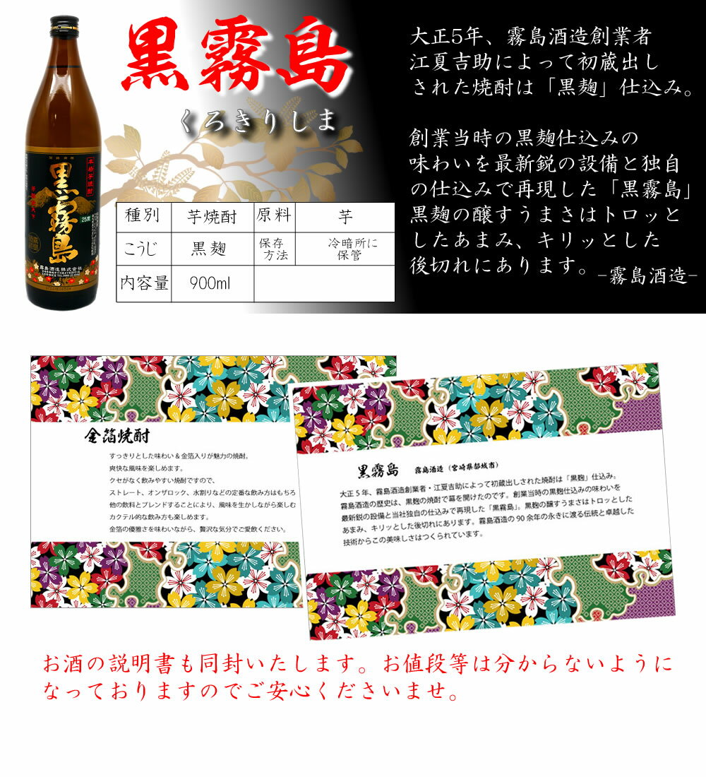 ギフト対応 銘酒芋焼酎「黒霧島」とメッセージラベルの金箔焼酎がセットになった 贈り物に最適な祝い酒! 全国にファンを持つ黒霧島!これを贈れば 間違い無し!との声も多く頂いております。